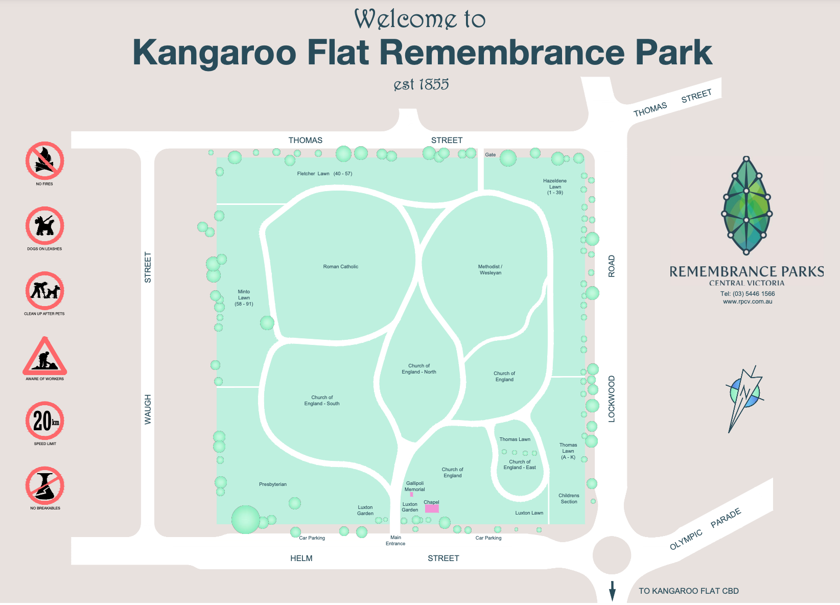 The Kangaroo Flat Remembrance Park is unique among Bendigo cemeteries, as all lawn graves on site have upright headstones, rather than plaques on concrete beams.